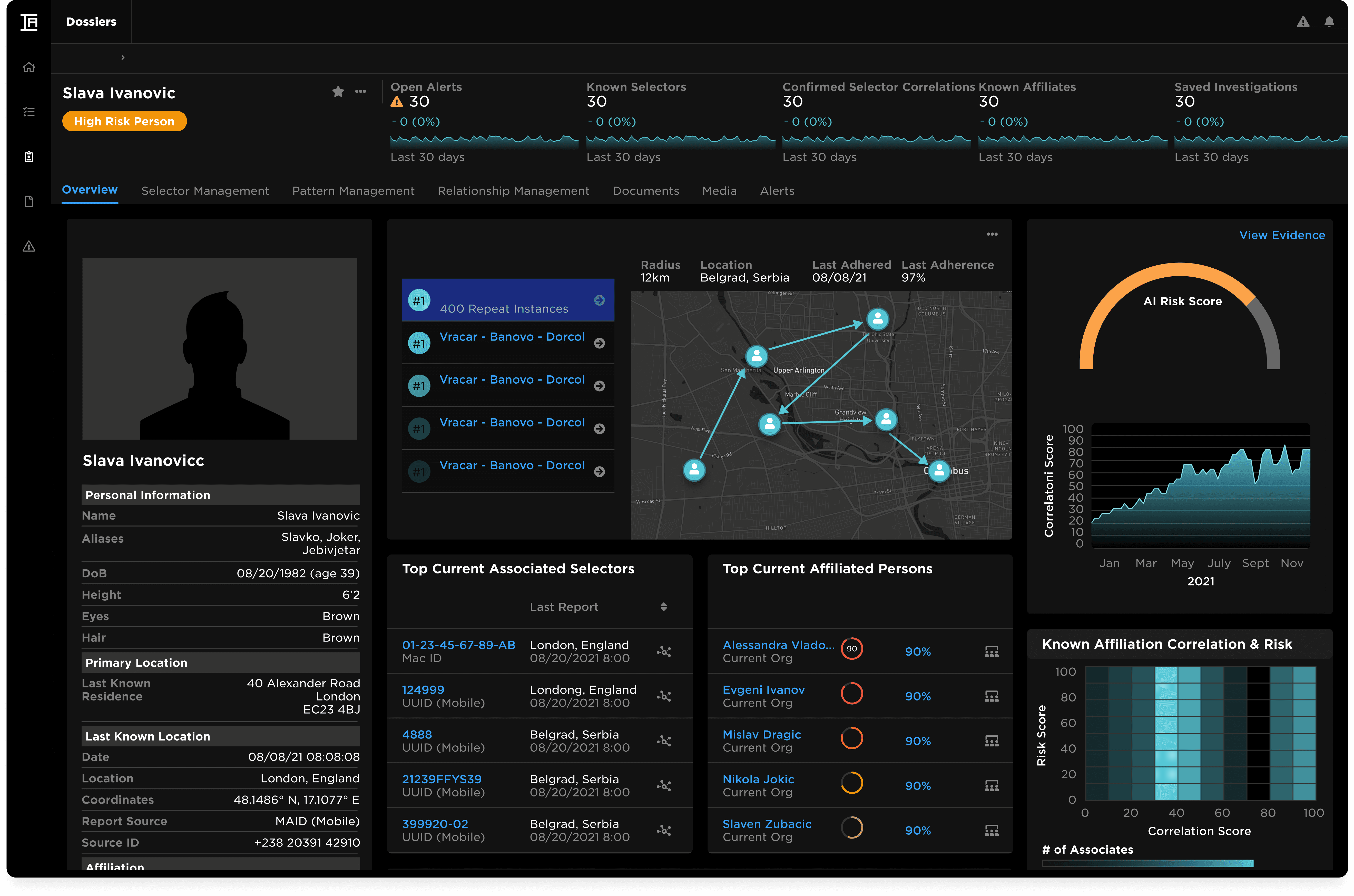I designed a geo-spatial and temporal intelligence platform that gave agents a unified operating picture to uncover relationships and intervene during international threats. The solution drove 4x faster suspect identification, 50% greater accuracy, and 10x faster crime trend reporting, leading to a $15M / 5-year contract secured on the strength of the UX.